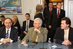 Bulgaria's Defense Minister, Nikolay Tsonev, followed by Foreign Minister, Ivaylo Kalfin, walk in to the Tuesday meeting of Ambassadors of NATO members in Bulgaria. Photo by Sofia Photo Agency.