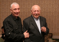 Todor Kolev, (R), a close friend and teacher of director, Dimitar Bozakov (L), was a special guest of the opening night of the play "A Servant of Two Masters". Photo by M3 Communications.