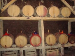 Just paces away, uphill from the Kordopulov house, we come to a conveniently located izba, dug straight into the hillside like a cozy hobbit hole. We follow a long narrow passage to the tasting room, surprisingly high-ceilinged considering it appears to be carved out of solid rock, and at least twenty degrees cooler than the hot summer afternoon sweltering outside the front door. We sit at one of several low tables set atop wine barrels and immediately ask for a round of "booket." This booket proves a bit of a bust, however. Instead of a delicate, edelweiss strain like our first glass we receive goblets full of a mostly tasteless, honey-colored beverage which we presume our host is trying to get rid of, considering the overflowing glasses he hands us. We can't quite down the lot though, and halfway through decide to abandon the task and jump ahead to the reds. The other customers of the izba this afternoon are all Bulgarian, about seven all told, and we watch as one after another place orders for bottles worth out of two of the four tapped barrels.