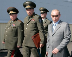 Russian President Vladimir Putin (R) followed by commander-in-chief of the space forces General Vladimir Popovkin (second R, others are unidentified) visits 'Voronezh' radar station in Leningrad region, of Russia, 11 August 2007. Photo by EPA/BGNES