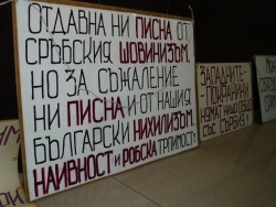 A poster is displayed during the Varna session of the World Parliament of Bulgarians. "We have enough of Serbian Chauvinism, but regretfully we also have enough of our own Bulgarian nihilism, naivety and slave mentality," the poster reads. Photo by DarikN