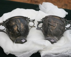 The two silver cups with gold coating featuring images of the ancient god Eros are among the most precious finds from the Karanovo tomb. Photo by BGNES