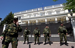 A cordon of special police forces stands in guard in front of Greek Liason Office during the press conference of united NGO's, held as a protest against Greek policy objecting Macedonian constitutional name, Skopje, 07 April 2008. Photo by EPA/BGNES
