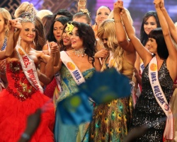 Bulgaria's entrant and other contestants celebrate with winner Victoriya Radochinskaya of Russia after she won the Mrs World 2009 beauty pageant in Vung Tau, Vietnam, November 22 2009. Unlike most pageants, the contestants in Mrs World are all married wom