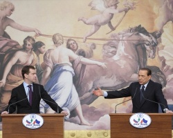 Medvedev gave a press conference in Rome together with the Italian Prime Minister Silvio Berlusconi after the two energy companies Gazprom and ENI signed an agreement allowing the French company EDF to join the South Stream project.