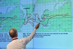 A member of the crisis committee of the German air traffic control shows Tuesday calculations about the extent of the ash cloud over Europe. Photo by BGNES