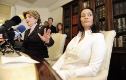 British actress Charlotte Lewis (R) and her attorney Gloria Allred speak to the media during a press conference in Los Angeles, California. Photo by BGNES