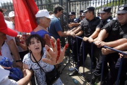 A woman shows her injured hand as protesters face riot police during a protest against Cabinet austerity measures outside the parliament building, Bucharest, Romania, 15 June 2010 Photo by EPA/BGNES