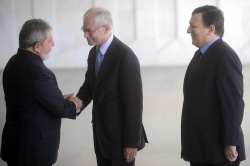 Brazilian President, Luiz Inacio Lula da Silva (L) shakes hands with the President of the European Council Herman Van Rompuy (C) as the President of the EC, Jose Manuel Durao Barroso during the 4th EU-Brazil Summit. Photo by EPA/BGNES