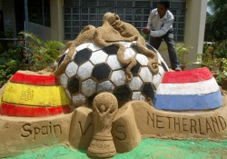 Sand artist Subal Maharana prepares the fortune legend Octopus Paul atop the Spain and Netherlands national flags as a sand sculpture on the eve of the final of the FIFA World Cup 2010 in Bhubaneswar city, India. Photo by EPA/BGNES