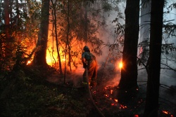 Russian firefighter works to extinguish a fire in a forest near the village of Ryazanovskiy, about 150 km from Moscow, Russia, late 04 August 2010. Photo by EPA/BGNES