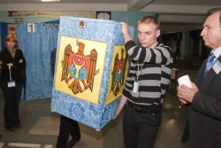 Members of the local electoral commission carry the ballot box for counting at a polling station after the voting dayin the lyceum Nicolai Gogol in Chisinau, Moldova, 05 September 2010. Photo by EPA/BGNES