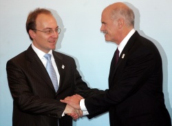 Macedonian Foreign Minister Milososki (left) with Greek PM Papandreou during an OSCE meeting in Athens in 2009. Photo by EPA/BGNES