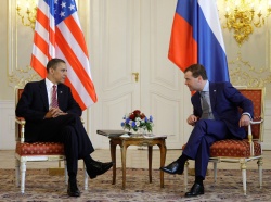 Russian President Dmitry Medvedev (R) and US President Barack Obama (L) meet before the signing ceremony of the 'New START Treaty in Prague, April, 2010. EPA/BGNES