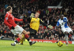 Manchester United's Dimitar Berbatov (C) beats Blakburn Rovers goalkeeper Paul Robinson to score his 5th goal in the English premier league match between ManUn and Blackburn at Old Trafford. Photo by EPA/BGNES