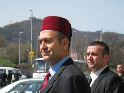 The notorious Ali Yuzeirov is shown walking out of the Shumen hotel wearing a red Turkish fez on the day he attempted to found the Muslim party OTOMAN. Photo by BGNES