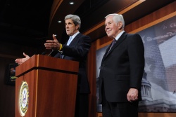 Democratic Senator John Kerry (L), chair of the Senate Foreign Relations Committee, and Republican Senator Dick Lugar (R) of Indiana deliver remarks after the Senate voted to rafity the START 2 treaty. EPA/BGNES