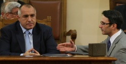 Economy Minister Traikov (right) extends his hand to PM Borisov after speaking during the confidence vote debates. Photo by BGNES
