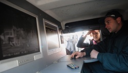 A Bulgarian border policeman monitors screens as European home affairs Commissioner, Cecilia Malmstrom looks on during her visit to the Kapitan Andreevo border crossing point between Bulgaria and Turkey, 11 February 2011. Photo by EPA/BGNES