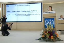 Catherine Ashton (R), European High Representative for Foreign Affairs and Security Policy, speaks during the opening session of the 16th Human Rights Council at the European headquarters of the UN in Geneva. Photo by EPA/BGNES