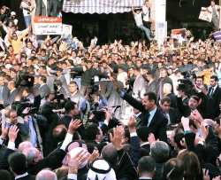 Syrian President Bashar Assad (C) waving to crowd after leaving the Syrian Parliament following his address to the Syrian nation in Damascus, Syria, on 30 March 2011. EPA/BGNES