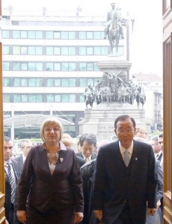 UN Secretary-General Ban Ki-moon (right) is pictured entering the Bulgarian Parliament with the monument of Bulgaria's Liberator, Russian Emperor Alexander II, in the background. Photo by BGNES