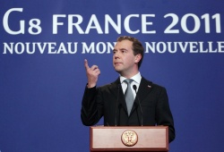 Russian President Dmitry Medvedev speaks during a press conference after the G8 summit in Deauville, France, 27 May 2011. EPA/BGNES