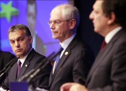 (L-R) Hungary`s Prime Minister, Viktor Orban, European Council President Herman Van Rompuy and European Commission President Jose Manuel Barroso at the end of EU summit in Brussels, 24 June 2011. EPA/BGNES