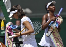Tsvetana Pironkova of Bulgaria (L) inbetween games against Venus Williams in their quarter final match at Wimbledon, when Pironkova scored a historic win against Willaims, 29 June 2010. EPA/BGNES