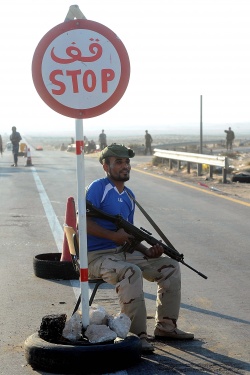 A Libyan rebel fighter guards a checkpoint near Ras Lanuf, east of Tripoli and Sirte, Libya, on 25 August 2011. EPA/BGNES