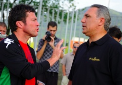 Former Bulgarian national soccer team head coach Lothar Matthaeus (L) talks with former Bulgarian soccer star Hristo Stoichkov (R) during a training session in Pravec, Bulgaria, 31 August 2011.