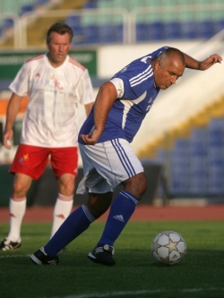 Bulgarian PM Boyko Borisov controlls the ball during a charity football game. Photo by BGNES