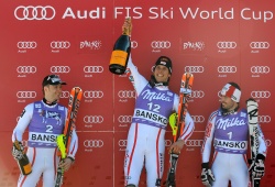 Austrians Mario Matt (C,first place), his teammate Reinfried Herbst (L,second place) and France Jean-Baptiste Grange (R,thirth place) celebrate on the podium after the Men`s Slalom World Cup competition at the Bulgarian ski resort of Bansko, Bulgaria, on