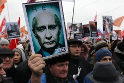 A man holds a portrait of Prime Minister Vladimir Putin reading `2050 - No` during a protest rally against alleged vote rigging in Russia`s parliamentary elections, Moscow, Russia, 10 December 2011.