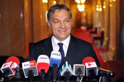 Hungarian Prime Minister Viktor Orban smiles as he briefs the media after he met with President of the Hungarian National Bank, the central bank, Andras Simor (unseen) in his office in the Parliament building in Budapest, Hungary, 06 January 2012. EPA/BGN