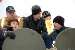New Bulgarian President, Rosen Plevneliev (c), and other officials toured the flooded town of Svilengrad on an armored carrier. Photo by BGNES