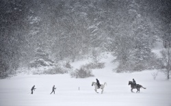 Horsemen gallop and skiers ski through the snow falling over the Gardet heath, a recreation area close to the Djurgarden natural park in Stockholm, Sweden. File photo EPA/BGNES