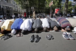 Muslims living in Paris, pray on the Rue des Poissoniers, Barbes neighborhood, in Paris, France, 10 September 2010. EPA/BGNES
