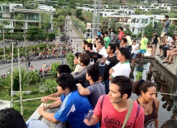 Tourists and Thai residents take shelter on a high rooftop watching the ocean seeking safety during a tsunami alert in Phuket, southern Thailand, 11 April 2012. EPA/BGNES
