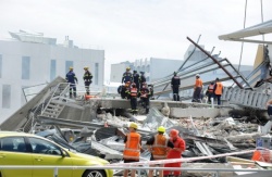 Rescue workers try and cut through large slabs of cement at the CTV building in Christchurch, New Zealand, on 24 February 2011. EPA/BGNES