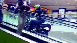 The bikers accessed the mall through its underground parking lot, rode through the escalators and disappeared through the main entry, their stunt lasting approximately a minute.