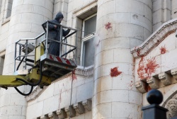 The entrance of Bulgarian capital Sofia's Palace of Justice, home of various judicial institutions and organizations, woke up "vandalized" with tomato paste a month ago. Photo by Sofia Photo Agency