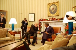 US President Barack Obama jokes about the karate skills of Bulgaria's Prime Minister Boyko Borisov, speaking before their one-to-one meeting at the White House Oval Office on Monday