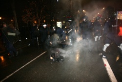 The tension escalated after angry protesters started throwing stones, smoke balls, bottles, and tomatoes at the police. Photo by BGNES