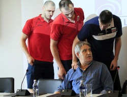 Coach Camillo Placi and the Bulgarian national men volleyball team gave a press conference in Sofia before departing for Poland. Photo by BGNES