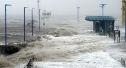 Waves lash the ferry pier on the North Sea coast in Dagebuell, Germany, 05 December 2013. EPA/BGNES