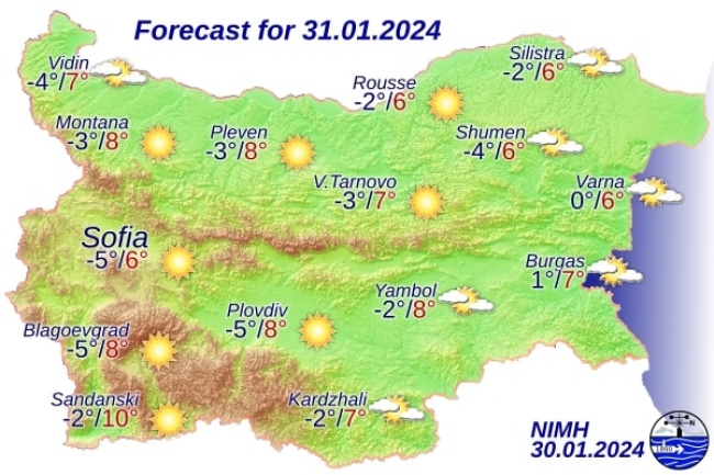 Inland Areas: The day is expected to begin with overcast skies in southernmost regions, gradually giving way to sunshine. Rain showers are a possibility before noon. Residents in eastern parts can expect the northerly winds to subside as the day progresses. Lows will range from minus 6°C to minus 1°C, with Sofia experiencing temperatures around minus 5°C. Highs will hover between 5°C to 10°C, with Sofia reaching around 6°C.