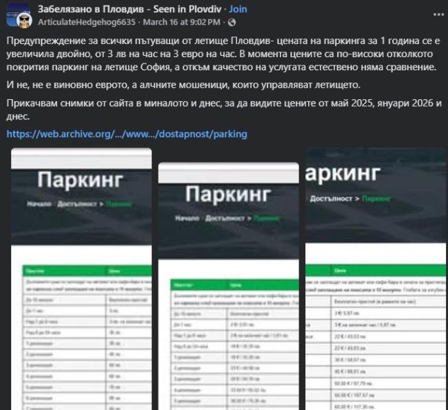 The citizen also compared rates with Sofia Airport, observing that economy parking at Terminal 2 is ten euros cheaper than at Plovdiv Airport, highlighting the absurdity of the situation.