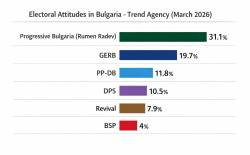 According to the latest Trend survey, “Progressive Bulgaria” is leading the polls ahead of the early parliamentary elections on April 19, with support from 31.1% of respondents who said they plan to vote. GERB follows in second place, polling at 19.7%, while "We Continue the Change-Democratic Bulgaria" (PP-DB) occupies third place with 11.8% backing.