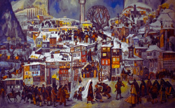 Created in Paris in 1970, “Two Weddings” is part of Boyadzhiev’s well-known second cycle of large-scale compositions. The work presents a layered winter scene in the Rhodope Mountains, where elements of everyday life are interwoven with two parallel wedding celebrations - one Christian and one Muslim. The composition also features symbolic architectural details, including a church bell tower and a minaret, set alongside a centuries-old tree, reinforcing themes of coexistence and tradition.